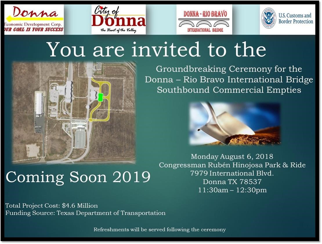 The Congressman Ruben Hinojosa International Park and Ride was dedicated on September 2015 to welcome international travelers to Donna and the Rio Grande Valley. The 1,800 square foot building and 200 parking spaces were constructed on 2.8 acres with a public partnership amongst the Lower Rio Grande Valley Development Council, Valley Metro, Federal Transit Administration and the City of Donna. The facility was created to act as a bus terminal to attract more shoppers to the region. Mexican shoppers can park their vehicles and ride a Valley Metro bus to popular shopping locations such as the Donna Walmart, HEB, or connect to buses going to the Outlet mall in Mercedes, La Plaza Mall in McAllen, or Port Isabel, all for no fare. The terminal offers a free Wi-Fi waiting area and tourist brochures. The first Saturday of every month, a City of Rio Bravo, Tamaulipas tourist bus also picks up and drops off international travelers making it a binational facility as well.